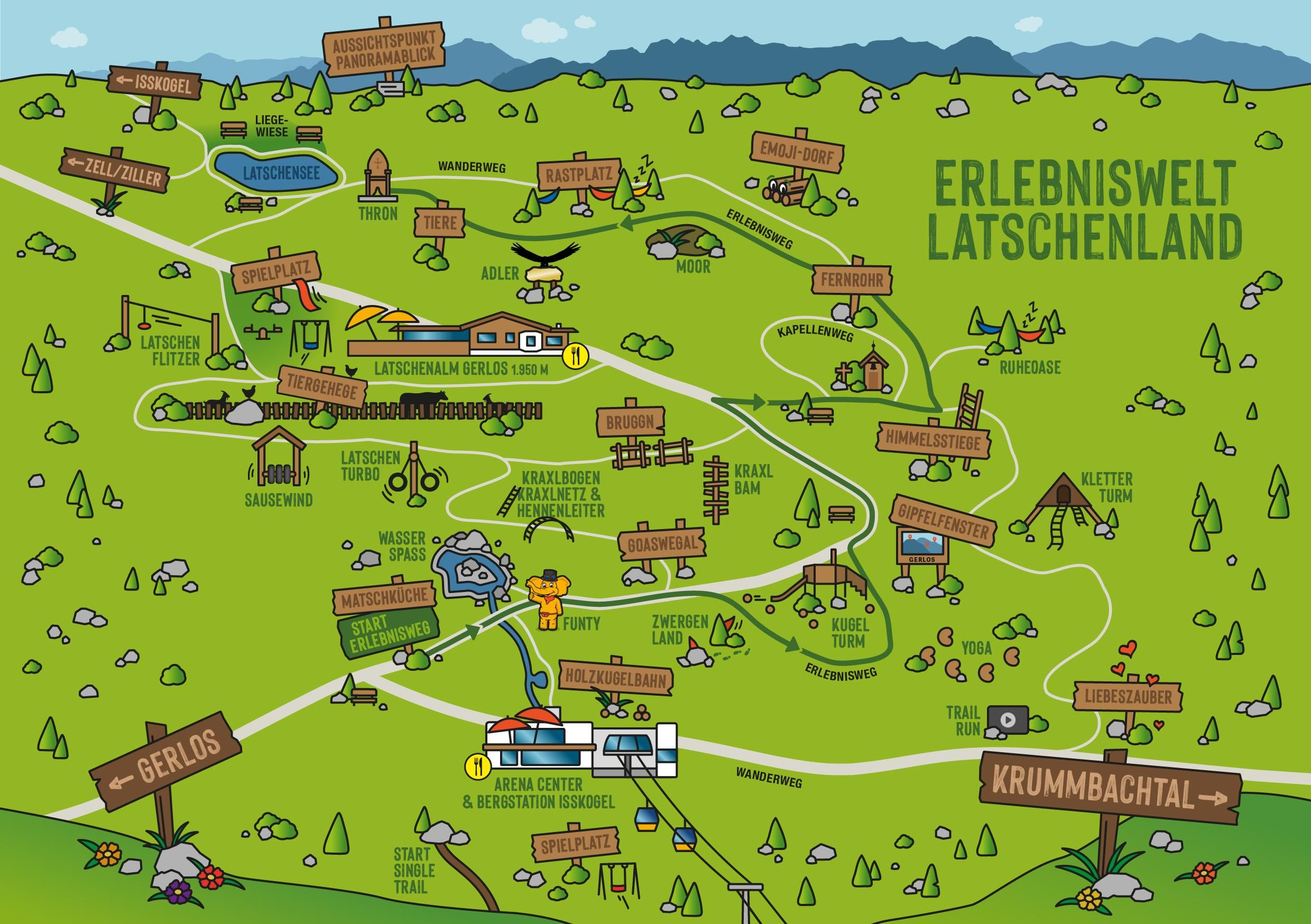 Het Latschenland Gerlos op de Isskogel is een natuurlijke beleveniswereld op ongeveer 1.950 meter boven zeeniveau. Ingebed in het alpenlandschap combineert het uitgestrekte gebied spel, beweging en ontspanning. Verschillende stations zoals knikkerbanen, themapaden en een klein dierengebied zorgen voor verschillende ervaringen, terwijl wandelpaden en stiltegebieden uitnodigen om te blijven hangen. Het resultaat is een plek waar natuur, verbeelding en activiteit op een onopvallende manier samenkomen.