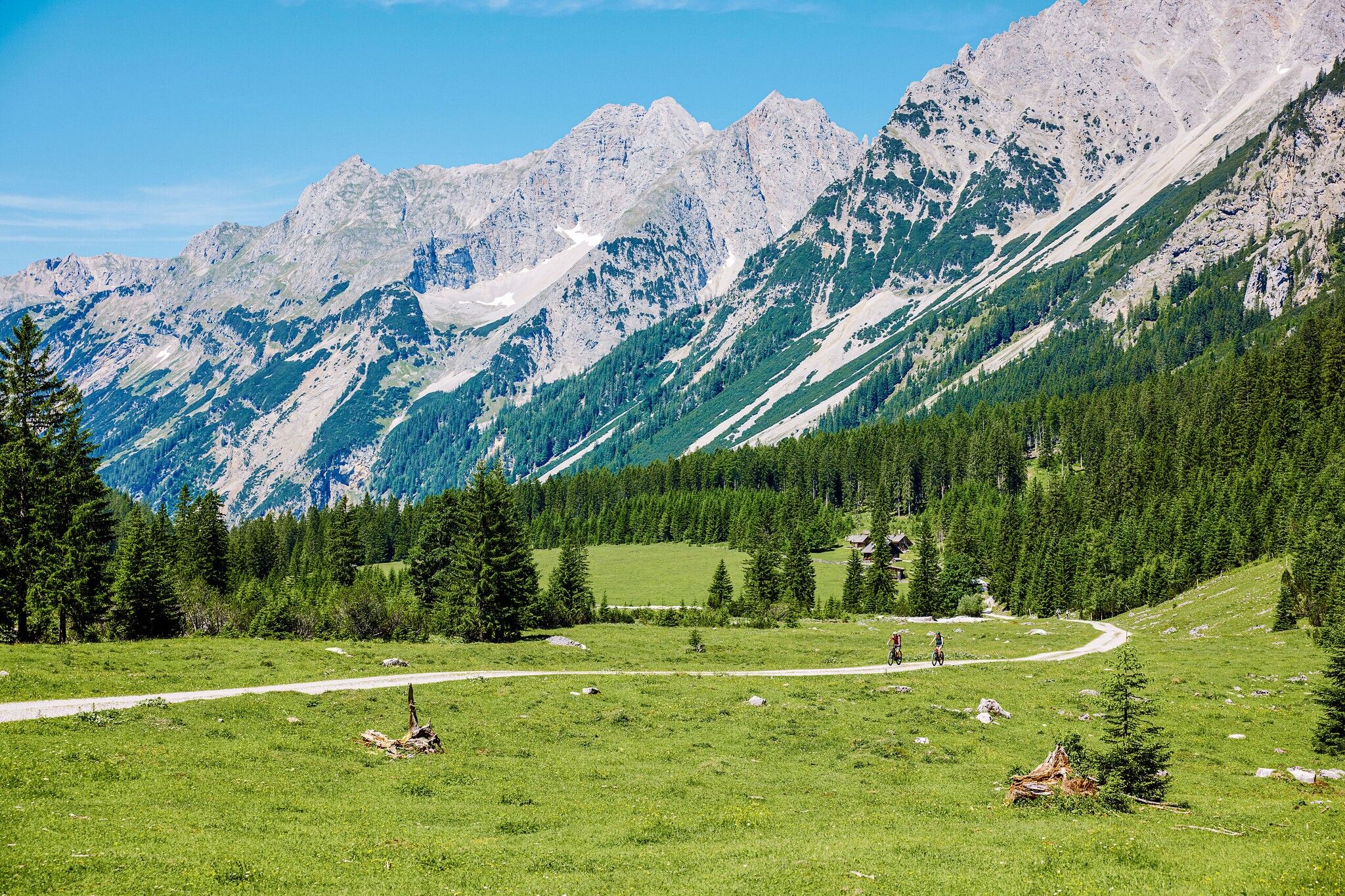 Misschien wel onze favoriet van de etappes - als je een eersteklas conditie en techniek hebt, raden we je ten zeerste aan de variant door de Karwendel te kiezen! Met twee pittige beklimmingen wordt hier het machtige natuurpark doorkruist, langs berghutten, watervallen en over de Plumsjoch. Hier moet je een bijzonder goede grip op het stuur hebben - we willen de naam immers niet te letterlijk nemen!