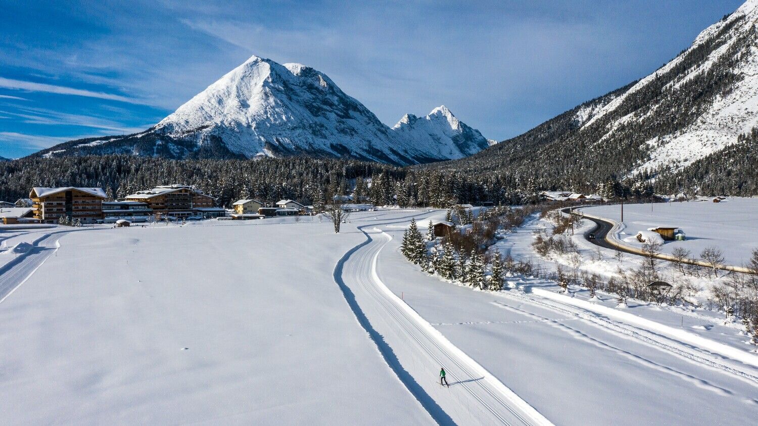 De A11-loipe "Bodenalm" is een minder bezochte loipe op een rustige locatie. Hij loopt vanaf het sportterrein in Scharnitz over besneeuwde alpenweiden en door schilderachtige bospassages langs de Drahnbach en de Gießenbach. Op de heen- en terugweg kom je langs het kleine dorpje Gießenbach, waar je kunt opwarmen en heerlijk kunt eten bij Gasthof Ramona.