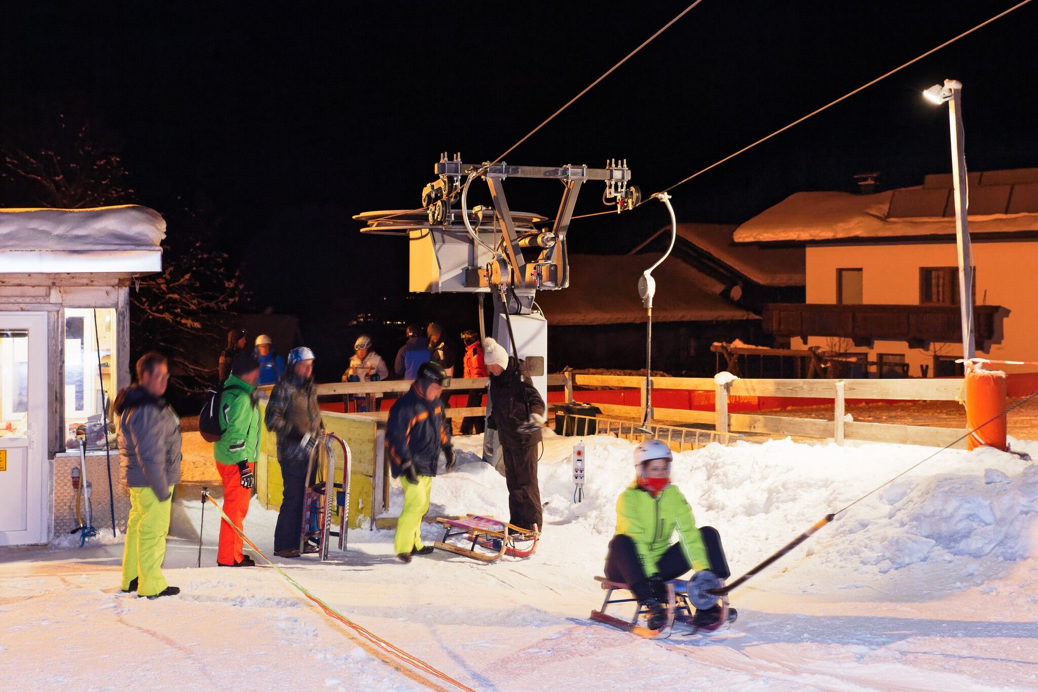 Rodelplezier met schijnwerpers. In Roggenboden wordt de afdaling aangepakt met speciaal ontwikkelde rodelsleeën. De haakconstructie zorgt voor een gemakkelijke en comfortabele klim met de sleeplift.