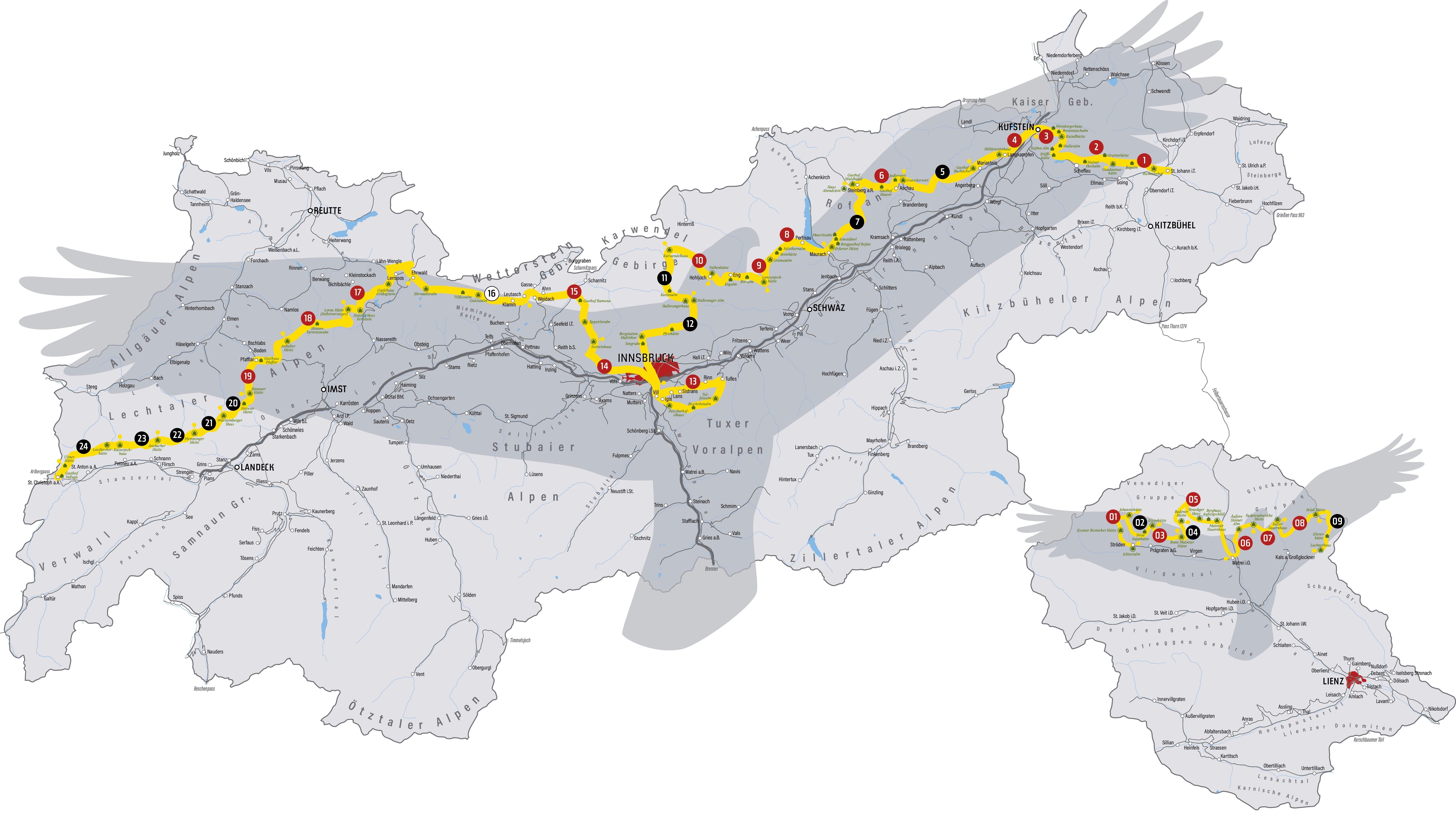- 24 etappes lopen door de bergen van Noord-Tirol, de tweede route doorkruist de Glockner- en Venedigergroepen van Oost-Tirol in negen dagetappes