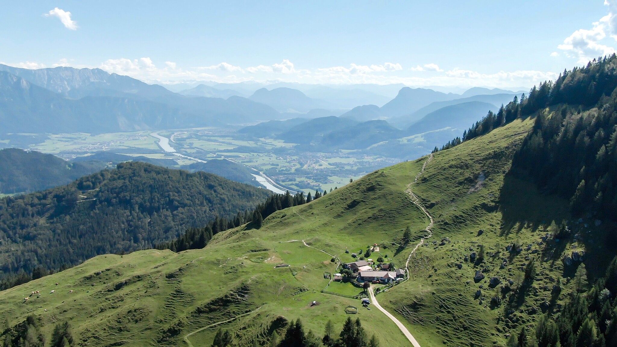 De afdaling gaat direct van de alm via het verharde bos- en alpenpad, eerst een beetje steiler, dan vlakker langs de Hintermoar Alm naar de parkeerplaats.