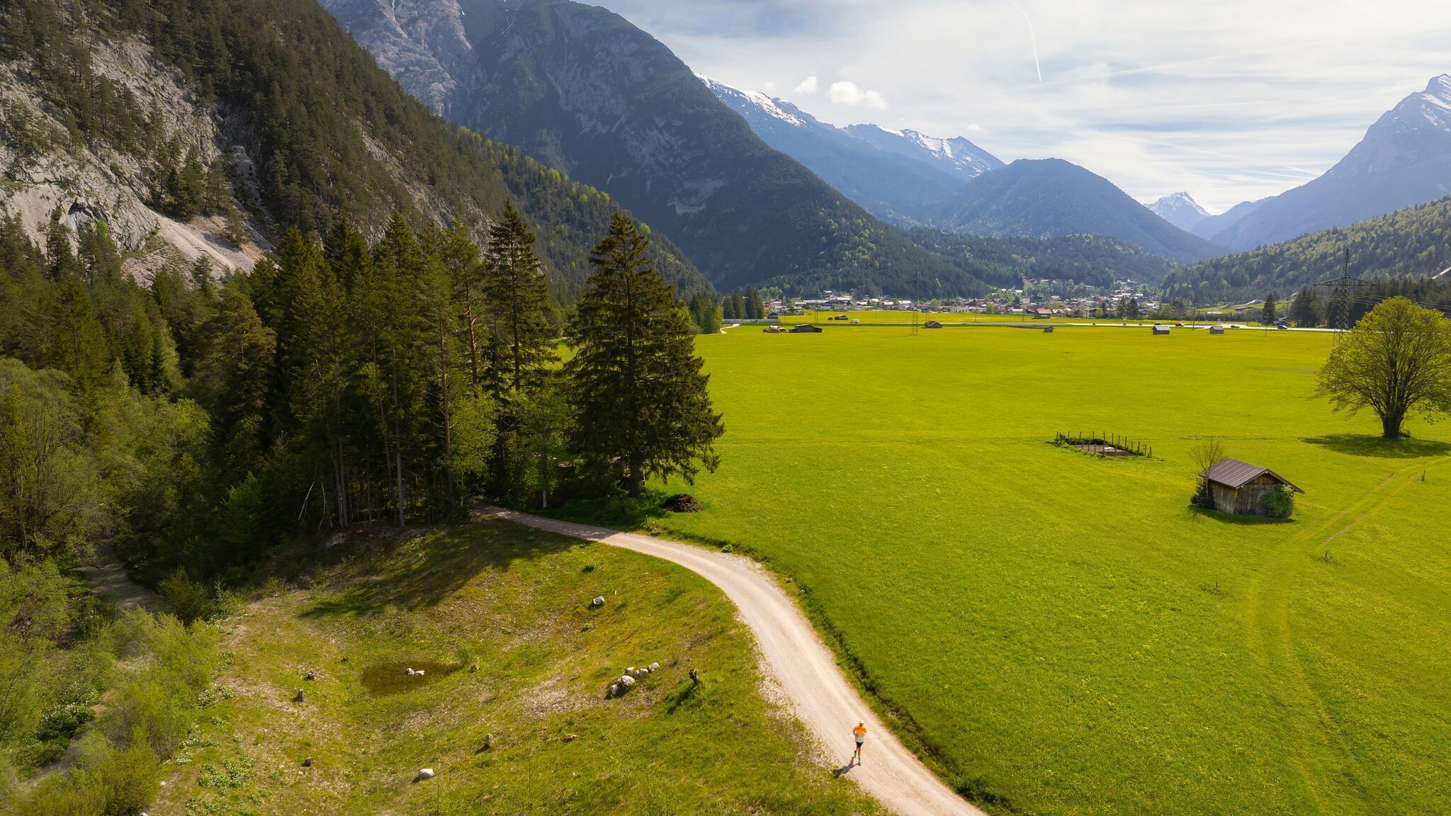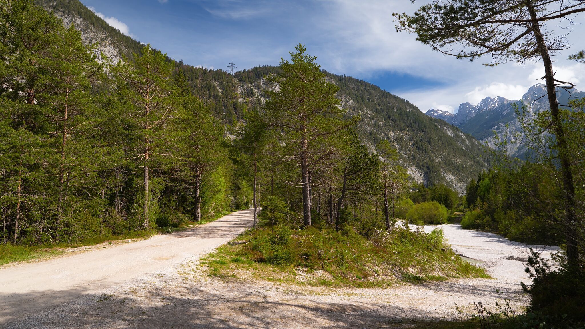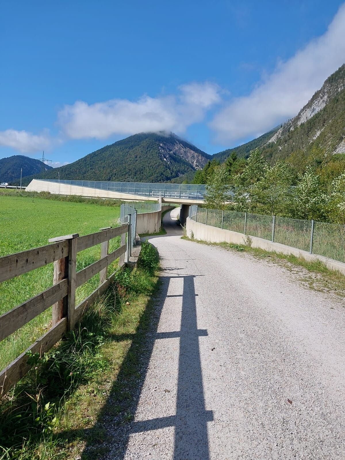 Aan het einde van het eerste deel van de grindweg sla je kort af naar een asfaltweg en volg je deze tot je een kleine brug bent overgestoken. Na de brug keer je terug naar een grindpad dat naar Gießenbach leidt. Vanaf hier leidt de goed onderhouden grindweg je langs het water bijna tot het einde van de wandeling. De schoonheid van het hoogplateau komt hier bijzonder goed tot zijn recht. Draai je af en toe om en voel de aanwezigheid van de Karwendel dalen en pieken die je omringen. Op deze weg is het meestal niet erg druk, zodat je van veel rustige momenten kunt genieten.